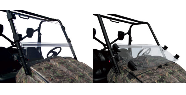 KAWASAKI TERYX FULL FOLDING WINDSHIELD close Quantity in Basket: None Code: 2317-0045 Price: $268.90 Quantity: Premium .177" thick clear polycarbonate shield. Centrally hinged for ventilation. Tool-less operation. Stainless steel rubber coated mount straps.