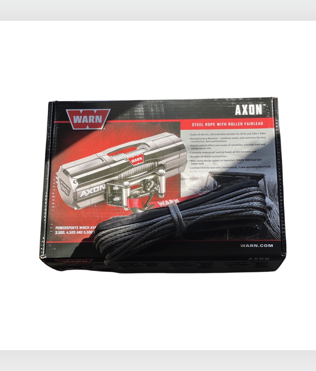 THIS KIT INCLUDES BOTH THE STEEL CABLE AND THE 1/4 X 50' SYNTHETIC ROPE. MSRP $1099.00 WARN's AXON 55 powersports winch is the most groundbrakeing and reliable powersports winch ever. The power, durability, and technical advancements make this winch a game-changer. The massive 5,500 lb capacity with a steel wire rope is for the biggest UTVs and the biggest pulls. The revolutionary Motactor combines motor and contactor for the best performance and easy installation. Included is a 50' x 1/4" steel rope, roller fairlead, and black hook, as well as a dash-mounted control switch and corded remote. Digital control offers never-before-seen levels of performance and user feedback that includes load and temperature information. The durable, all-metal construction features black powder-coated finish for corrosion resistance and the waterproof sealing keeps the elements out. The new clutch design is based on the legendary WARN 4WD hub lock know-how. The three-stage planetary gear train is all-metal, smooth, and reliable, and the load-holding mechanical brake offers great control.
